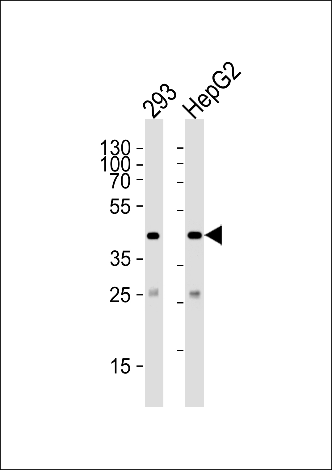 Western blot analysis of lysates from 293, HepG2 cell line (from left to right), using SIRT3 Antibody (C-term)( AMM04368G). AMM04368G was diluted at 1:1000 at each lane. A goat anti-rabbit IgG H&L(HRP) at 1:5000 dilution was used as the secondary antibody. Lysates at 35ug per lane. |