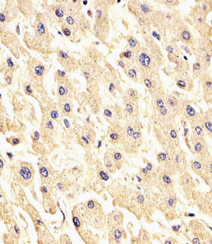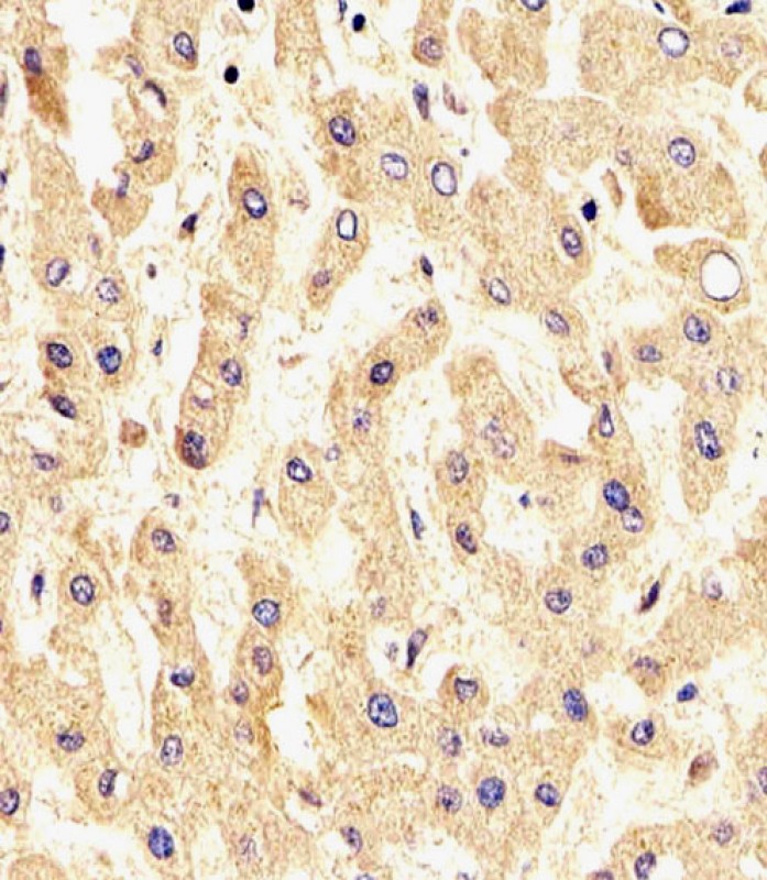 AP6261A staining SOST in Human liver tissue sections by Immunohistochemistry (IHC-P - paraformaldehyde-fixed, paraffin-embedded sections). Tissue was fixed with formaldehyde and blocked with 3% BSA for 0. 5 hour at room temperature; antigen retrieval was by heat mediation with a citrate buffer (pH6). Samples were incubated with primary antibody (1/25) for 1 hours at 37°C. A undiluted biotinylated goat polyvalent antibody was used as the secondary antibody. |