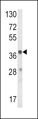 Western blot analysis of HAO1 Antibody (Center) (Cat. AMM05297G) in mouse liver tissue lysates (35ug/lane). HAO1 (arrow) was detected using the purified Pab. |