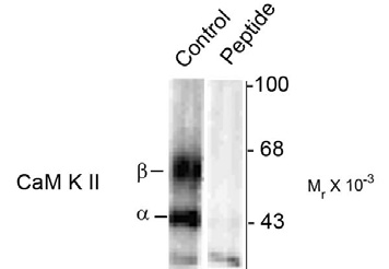 Western blot of rat brain lysate showing specific immunolabeling of the~50k α- and the ~60k β-CaM Kinase II phosphorylated at Thr305 (Control). Theimmunolabeling is blocked by the phosphopeptide used as the antigen (Peptide)but not by the corresponding dephosphopeptide (not shown). |