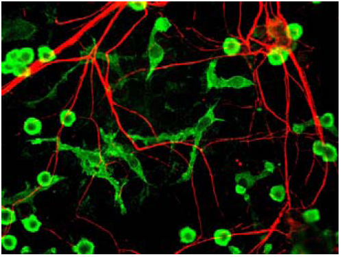 Immunostaining of cultured neurons and glia showing specific labeling of neuronal processes (red) using our alpha-internexin antibody and microglia (green) with a coronin 1a antibody. |