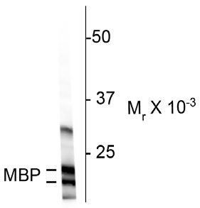 Myelin Basic Protein (MBP) is one of the major proteins of the myelin sheath surrounding axons in the nervous system. Since it is of relatively low molecular weight and high abundance the protein sequence was determined from purified protein over 30 years ago (Eylar et al., 1971). The protein is made by oligodendrocytes in the central nervous system, so antibodies to MBP are good markers of this cell type. However, transcripts from the same gene are also expressed in certain hematopoetic lineage cells (Marty et al., 2002). In the central nervous system there are there different forms of the protein made by alternate transcription from a single gene, which have molecular weights of 21.5, 18.5, and 17.2 kDa. Since the two lower molecular weight forms are very close in molecular size, MBP antibodies typically show two bands on Western blots, one at about 22kDa and another at about 18kDa.