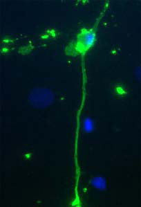 Rat mixed neuron/glial cultures stained with chicken anti-MyelinBasic Protein (green). Blue is a DNA stain. Note that the Myelin Basic Protein antibody stainsan oligodendrocyte and some membrane shed from this cell. Other cells in the field includeneurons, astrocytes, microglia and fibroblasts, all of which are completely negative. |