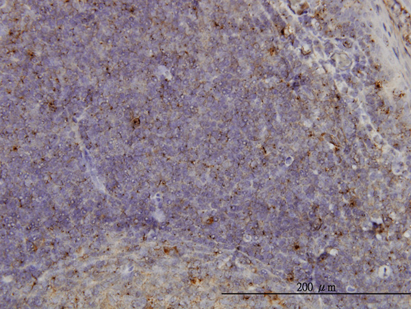 Immunoperoxidase of monoclonal antibody to MCF2L on formalin-fixed paraffin-embedded human tonsil. [antibody concentration 1 ug/ml]
