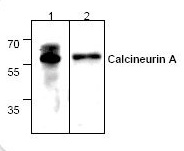 Western blot analysis of Calcineurin A in lysate from Jurkat cells (Lane 1) and rat kidney (Lane 2). |