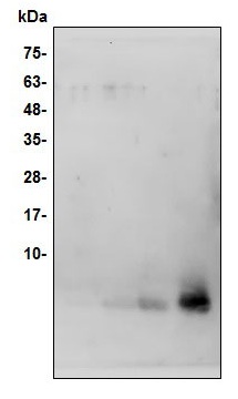 Western blot with BNP antibody: Lane 1: 10 ng human BNP; Lane 2: 50 ng human BNP; Lane 3: 200 ng human BNP; Lane 4: 1 μg human BNP |