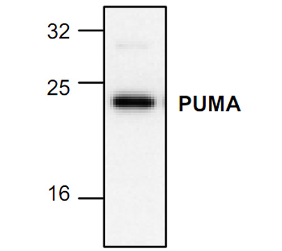 PUMA (p53 upregulated modulator of apoptosis) is one of the pro-apoptotic Bcl-2 family members which are also transcriptional targets of p53. PUMA gene encodes two BH3 domain-containing proteins termed PUMA-α and PUMA-β. PUMA proteins bind Bcl-2, localize to the mitochondria, and induce cytochrome c release and apoptosis in response to p53. PUMA may be a direct mediator of p53-induced apoptosis.