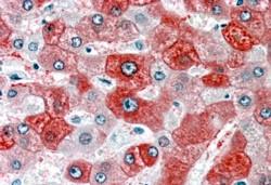 AMM04847G (3.8 μg/ml) staining of paraffin embedded Human Liver. Steamed antigen retrieval with citrate buffer pH 6, AP-staining. |