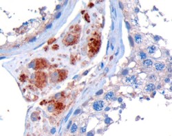 APR16238G (10 μg/ml) staining of paraffin embedded Human Testis. Microwaved antigen retrieval with Tris/EDTA buffer pH9, HRP-staining.