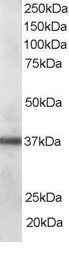 AMM04936G staining (0.1 μg/ml) of human lung lysate (RIPA buffer, 35 μg total protein per lane). Primary incubated for 1 hour. Detected by western blot using chemiluminescence. |