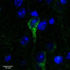 Confocal image (3 μm) of AMM04946G (0.3 μg/ml) staining in green a dendrite of a neuronal cell in C57 mouse cortex. Counter-stained with DAPI (in blue). Data kindly provided by Dr Y. Chen, TZ Baram lab, UC Irvine, CA. |