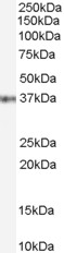 APR12103G (0.1 μg/ml) staining of Jurkat cell lysate (35 μg protein in RIPA buffer). Primary incubation was 1 hour. Detected by chemiluminescence.