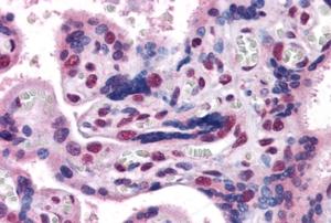 APR12103G (3.8 μg/ml) staining of paraffin embedded Human Placenta. Steamed antigen retrieval with citrate buffer pH 6, AP-staining. |