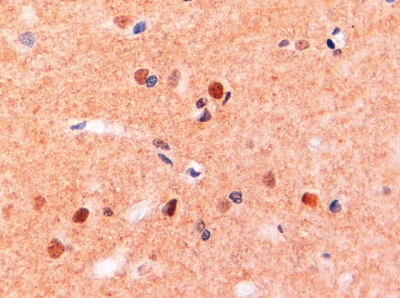 APR12120G (2 μg/ml) staining of paraffin embedded Human Brain. Steamed antigen retrieval with Tris/EDTA buffer pH 9, HRP-staining.