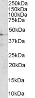 AMM05036G (1 μg/ml) staining of Human Brain lysate (35 μg protein in RIPA buffer). Primary incubation was 1 hour. Detected by chemiluminescence. |