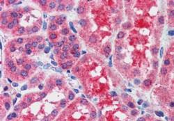APR16397G (2.5 μg/ml) staining of paraffin embedded Human Kidney. Steamed antigen retrieval with citrate buffer pH 6, AP-staining.