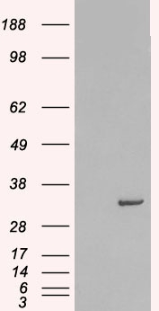 APR16404G (0.3 μg/ml) staining of human lymph node lysate (35 μg protein in RIPA buffer). Primary incubation was 1 hour. Detected by chemiluminescence.