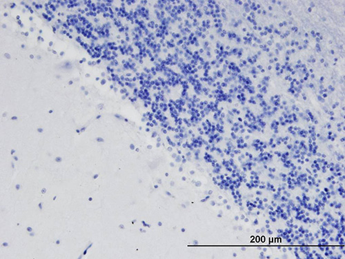 AMM06884G (1.5 μg/ml) staining of paraffin embedded Human Cerebellum. Steamed antigen retrieval with citrate buffer pH 6, AP-staining.