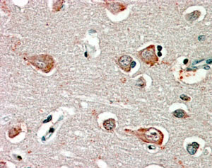 AMM05892G (2.5 μg/ml) staining of paraffin embedded Human Cortex. Steamed antigen retrieval with citrate buffer pH 6, AP-staining. |