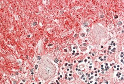 AMM04829G (3.8 μg/ml) staining of paraffin embedded Human Cerebellum. Steamed antigen retrieval with citrate buffer pH 6, AP-staining. |