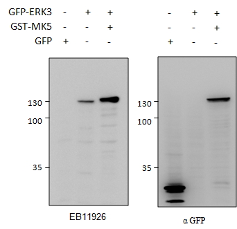 HEK293 lysate (10ug protein in RIPA buffer) overexpressing GFP-fused Mouse ERK3 probed with APR15867G (0.5ug/ml) in left panel and with anti-GFP in right panel. GFP-only exression in the first lane. Primary incubations were for 2 hours. Detected by chemiluminescence.