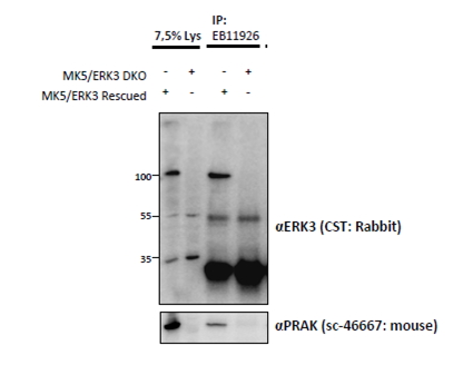 APR15867G (1.5ug) immunoprecipitation from lysates of MK5/ERK3 double knockout MEFs, with (third lane) and without (fourth lane) rescued MK5/ERK3 expression through retroviral transduction. The corresponding lysates (first and second lane resp.) were analyzed in parallel in this Western blot labelled with rabbit anti-Erk3 (and co-precipitation was measured using mouse anti-MK5/PRAK in the lower panel). |