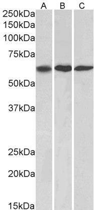 APR08464G (1 μg/ml) staining of NIH3T3, (A) A549 (B) and HeLa (C) lysates (35 μg protein in RIPA buffer). Primary incubation was 1 hour. Detected by chemiluminescence. |