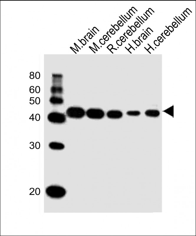 All lanes : Anti-GLUL Antibody (N-term) at 1:1000 dilution Lane 1: mouse brain lysates Lane 2: mouse cerebellum lysates Lane 3: rat cerebellum lysates Lane 4: human brain lysates Lane 5: human cerebellum lysates Lysates/proteins at 20 μg per lane. Secondary Goat Anti-Rabbit IgG, (H+L), Peroxidase conjugated at 1/10000 dilution Predicted band size : 42 kDa Blocking/Dilution buffer: 5% NFDM/TBST. |