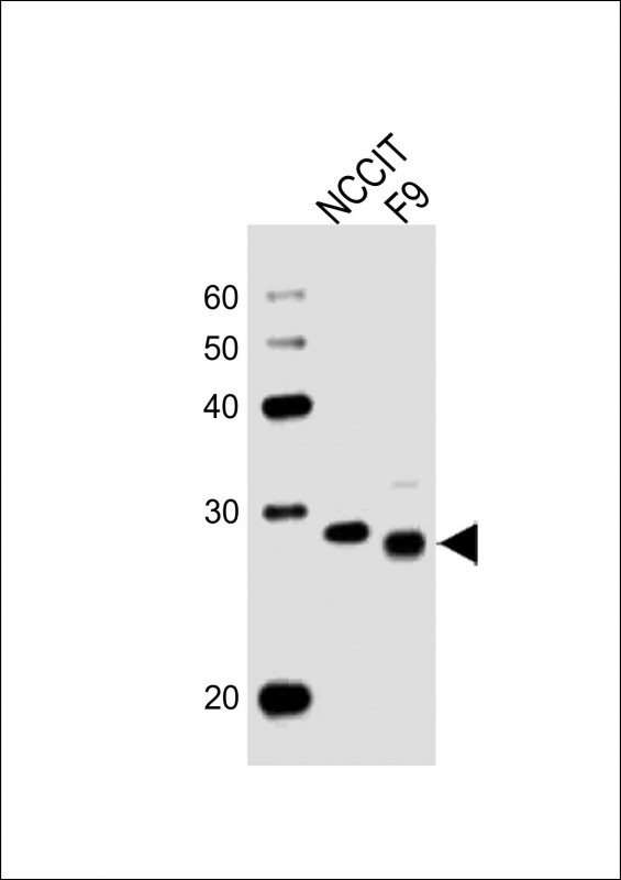 All lanes : Anti-LIN28A Antibody (N-term) at 1:1000 dilution Lane 1: NCCIT whole cell lysates Lane 2: F9 whole cell lysates Lysates/proteins at 20 μg per lane. Secondary Goat Anti-Rabbit IgG, (H+L), Peroxidase conjugated at 1/10000 dilution. Predicted band size : 23 kDa Blocking/Dilution buffer: 5% NFDM/TBST. |