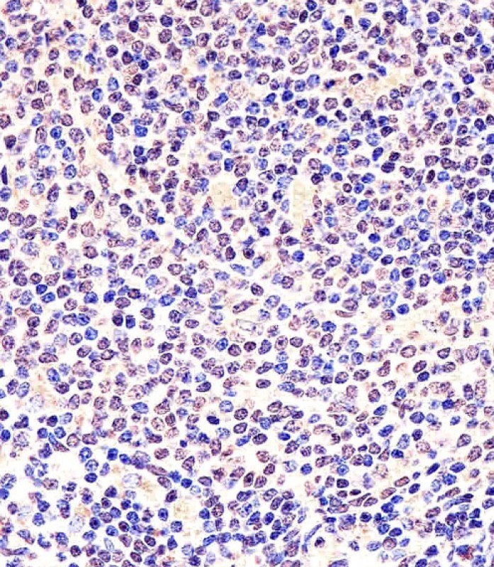 AMM06449G staining Mouse Nkx2-5 in mouse spleen sections by Immunohistochemistry (IHC-P - paraformaldehyde-fixed, paraffin-embedded sections). Tissue was fixed with formaldehyde and blocked with 3% BSA for 0. 5 hour at room temperature; antigen retrieval was by heat mediation with a citrate buffer (pH6). Samples were incubated with primary antibody (1/25) for 1 hours at 37°C. A undiluted biotinylated goat polyvalent antibody was used as the secondary antibody.
