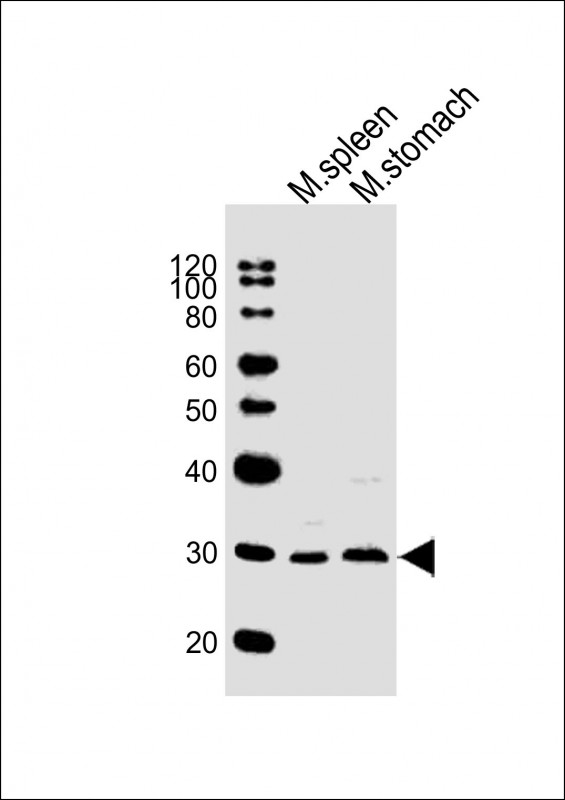 All lanes : Anti-Nkx2-5 Antibody (Center) at 1:2000 dilution Lane 1: mouse spleen lysates Lane 2: mouse stomach lysates Lysates/proteins at 20 μg per lane. Secondary Goat Anti-Rabbit IgG, (H+L), Peroxidase conjugated at 1/10000 dilution. Predicted band size : 34 kDa Blocking/Dilution buffer: 5% NFDM/TBST. |