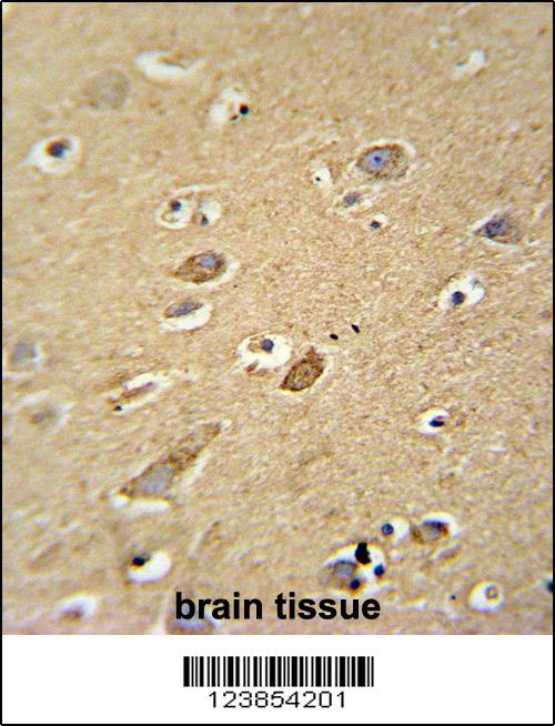 ATP5H antibody (Center) (Cat. APG02131G) immunohistochemistry analysis in formalin fixed and paraffin embedded human brain tissue followed by peroxidase conjugation of the secondary antibody and DAB staining. This data demonstrates the use of the ATP5H antibody (Center) for immunohistochemistry. Clinical relevance has not been evaluated.