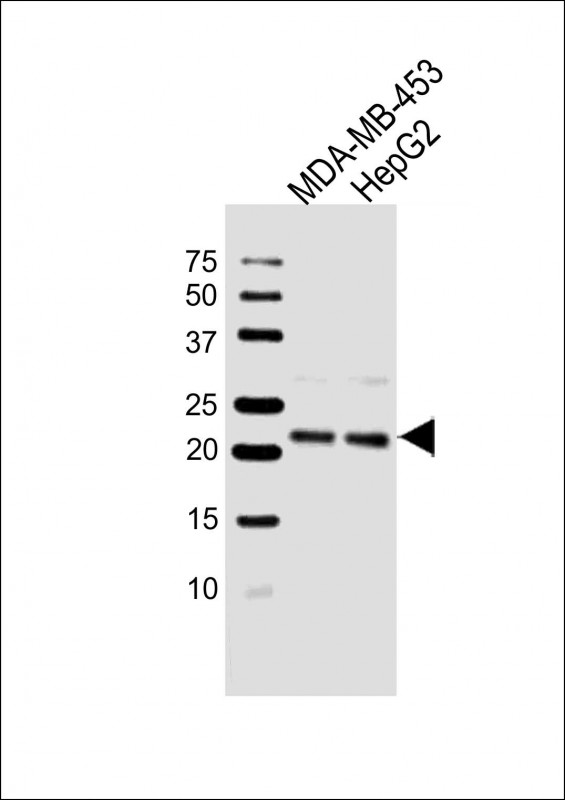 All lanes : Anti-ATP5H Antibody (Center) at 1:1000 dilution Lane 1: MDA-MB-453 whole cell lysate Lane 2: HepG2 whole cell lysate Lysates/proteins at 20 μg per lane. Secondary Goat Anti-Rabbit IgG, (H+L), Peroxidase conjugated at 1/10000 dilution. Predicted band size : 18 kDa Blocking/Dilution buffer: 5% NFDM/TBST.