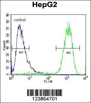 ATP5H Antibody (Center) (Cat. APG02131G) flow cytometric analysis of HepG2 cells (right histogram) compared to a negative control cell (left histogram).FITC-conjugated goat-anti-rabbit secondary antibodies were used for the analysis. |