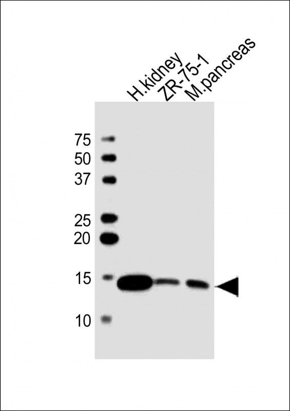 All lanes : Anti-ATP6V1G1 Antibody (C-term) at 1:1000 dilution Lane 1: human kidney lysate Lane 2: ZR-75-1 whole cell lysate Lane 3: mouse pancreas lysate Lysates/proteins at 20 μg per lane. Secondary Goat Anti-Rabbit IgG, (H+L), Peroxidase conjugated at 1/10000 dilution. Predicted band size : 14 kDa Blocking/Dilution buffer: 5% NFDM/TBST. |