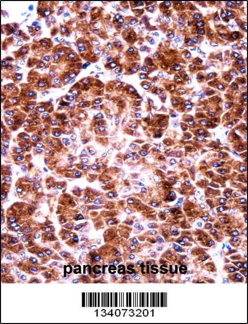 USO1 Antibody (C-term) (AMM08444G)immunohistochemistry analysis in formalin fixed and paraffin embedded human pancreas tissue followed by peroxidase conjugation of the secondary antibody and DAB staining.This data demonstrates the use of USO1 Antibody (C-term) for immunohistochemistry. Clinical relevance has not been evaluated.