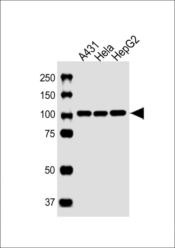 All lanes : Anti-USO1 Antibody (C-term) at 1:1000 dilution Lane 1: A431 whole cell lysate Lane 2: Hela whole cell lysate Lane 3: HepG2 whole cell lysate Lysates/proteins at 20 μg per lane. Secondary Goat Anti-Rabbit IgG, (H+L), Peroxidase conjugated at 1/10000 dilution. Predicted band size : 108 kDa Blocking/Dilution buffer: 5% NFDM/TBST. |