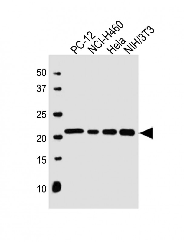 All lanes : Anti-TMED10 Antibody (C-term) at 1:1000 dilution Lane 1: PC-12 whole cell lysate Lane 2: NCI-H460 whole cell lysate Lane 3: Hela whole cell lysate Lane 4: NIH/3T3 whole cell lysate Lysates/proteins at 20 μg per lane. Secondary Goat Anti-Rabbit IgG, (H+L), Peroxidase conjugated at 1/10000 dilution. Predicted band size : 25 kDa Blocking/Dilution buffer: 5% NFDM/TBST. |