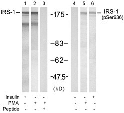Western blot analysis of extracts from 293 cells treated with insulin(100nM, 30min) or PMA (0.2? ?M, 15min) using IRS-1 Antibody (S636) ( AE1018a, Lane 1, 2 and 3) and Phospho-IRS-1-S636 Antibody ( APR09170G, Lane 4, 5 and 6).