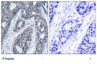 Immunohistochemical analysis of paraffin-embedded human breast carcinoma tissue, using Phospho-IRS-1-S636 Antibody ( APR09170G). |