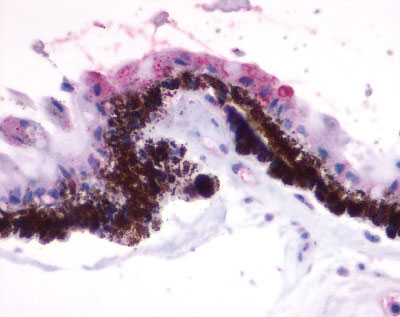 Anti-RGR antibody APR13095G IHC of human eye, pigmented epithelium within the retina. |