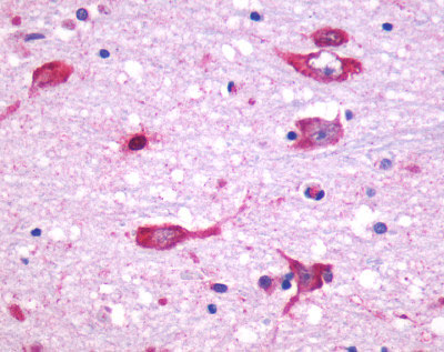 Anti-CHRM5 antibody APG03210G IHC of human brain, neurons and glia. |