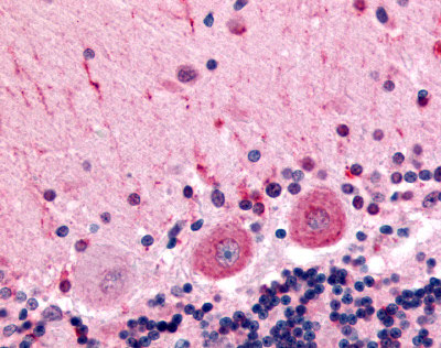Anti-CELSR3 antibody APR11576G IHC of human brain, Purkinje neurons. |
