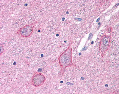 Anti-GRM3 / MGLUR3 antibody APR12295G IHC of human brain, neurons and glia.