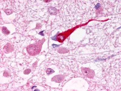 Anti-Galanin Receptor 1 / GALR1 antibody IHC of human brain, hypothalamus arcuate nucleus. |