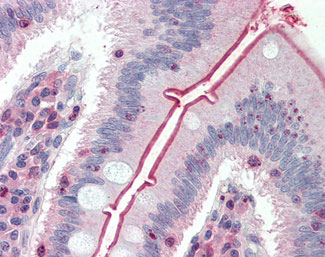 Anti-SLC5A1 / SGLT1 antibody APR10127G IHC of human small intestine. |