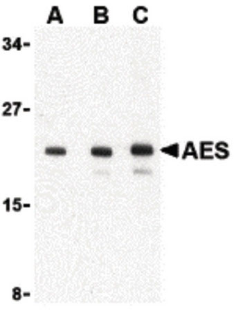 Western blot of AES in 293 cell lysate with AES antibody at (A) 1, (B) 2 and (C) 4 ug/ml. |
