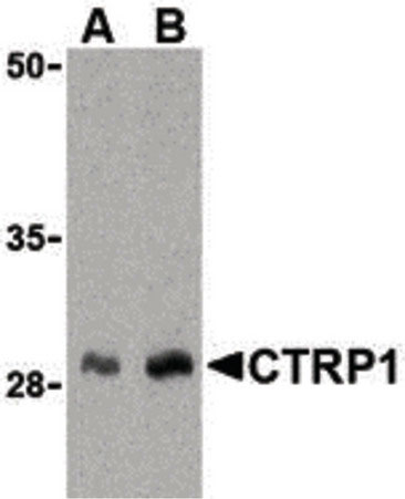 Western blot of CTRP1 in human kidney cell lysate with CTRP1 antibody at (A) 1 and (B) 2 ug/ml.