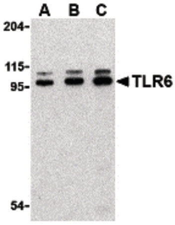 Western blot of TLR6 in Jurkat cell lysate with TLR6 antibody at (A) 0.5, (B) 1 and (C) 2 ug/ml.