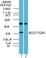 Western blot of human BG37/TGR5 in human kidney lysate in the 1) absence and 2) presence of...
